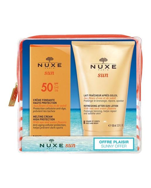 La crema rostro Sun SPF 50 de Nuxe proporciona una alta protección solar con un factor de protección 50, ideal para pieles expuestas a altos niveles de radiación. Este pack incluye 50 ml de crema fundente de alta protección para el rostro y 100 ml de leche refrescante para aplicar después de la exposición al sol, tanto en rostro como en cuerpo. Con este ritual de protección de verano, disfrutarás del sol con 100% placer.